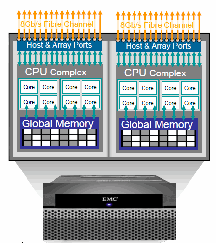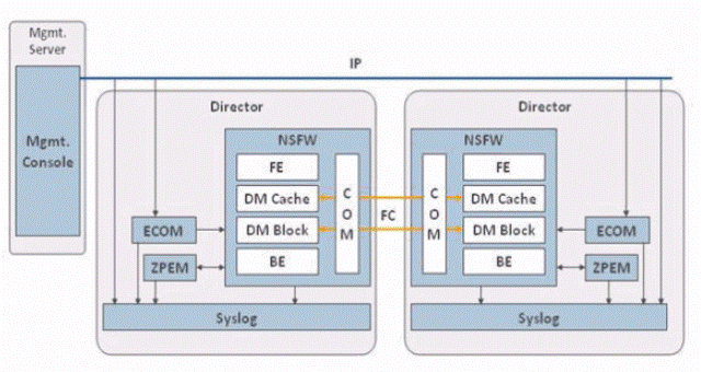 單一部引擎均配置了雙控制器(Director),以及雙管理模組,以控管I/O流量,包含讀取、寫入、SCSI指令、錯誤資訊等。而單一Director內包含了供讀取用的32 GB Cache記憶體,以及30 GB的SSD(solid state drive)存放韌體GeoSynchrony與管理相關軟體。(圖4)