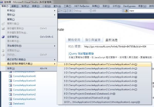 不過到了Visual Studio 2010不但可以直接在啟始頁「釘選」特定專案,讓該專案能夠永久停留在「最近使用的專案清單」裡,還能隨時將不需要留存在上面的專案從此清單移除。