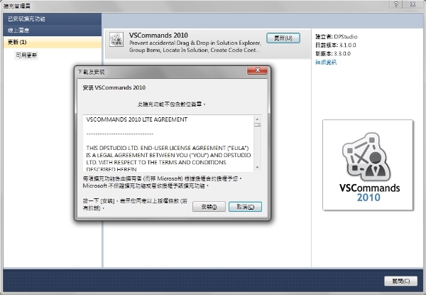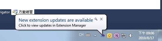 如果你已安裝的擴充套件有更新版出現時,當開啟Visual Studio 2010時也會主動提醒你有更新的擴充套件出現,讓你可以直接升級到最新版本。