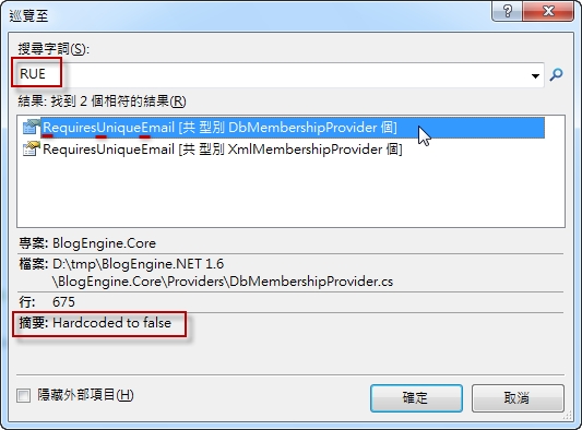 除了可搜尋型別名稱、所有成員名稱、檔案名稱等,此功能還提供以Pascal Case規則命名的項目。例如:當你搜尋RUE時,它會幫你搜尋專案中所有以R + U + E順序命名的型別或成員名稱。甚至點選到這些型別或成員上,還會自動顯示出透過XML組解的