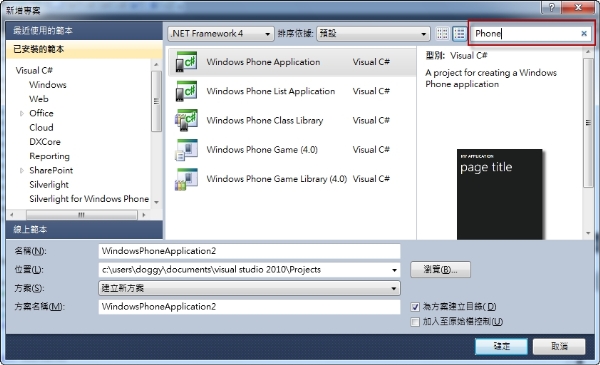 例如在新增專案視窗中,利用搜尋框提供的共通快速鍵「Ctrl」+「E」,就可以把鍵盤游標轉移到搜尋框,再輸入關鍵字Phone,就可以篩選出專案範本名稱中有Phone字詞的項目。這時,如果你還想繼續用鍵盤選取項目的話,則可以按「3次Tab鍵」,即可跳到選取專案範本的位置。
