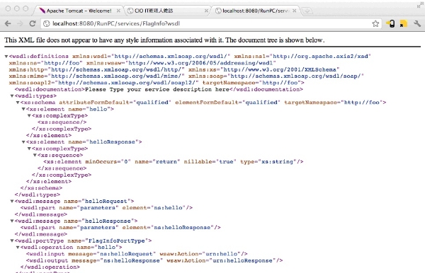 以FlagInfo來說,這個服務的定義是在一組叫作WSDL的XML之中定義的。你可以直接點擊FlagInfo之中看到它的內容如圖12。在這邊看起來是一組複雜的XML,但是你不用太擔心,在這邊我們需要注意的只有幾個重點。第一個是你可以看到targetNamespace指的是http://foo,也就是你的package名字,這個在之後的客戶端聯線時會需要使用。另外在這個WSDL之中你也可以看到所需要傳入的參數與傳回的參數。不過在這個例子之中為了簡便,我們使用沒有參數的方式來實作,所以不需要太仔細看這個檔案,你只要了解它的結構即可。