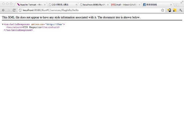 在知道了WSDL的檔案之後,讓我們看看這個web services到底提供了什麼樣子的服務。你可以看到我們有一個服務是FlagInfo,裡面有一個函數是hello,它會提供CIO Magazine的這個字串。因此就讓你使用如下的URL,讓我們先用手動來設定。你可以在瀏覽器底下輸入http://localhost:8080/RunPC/services/FlagInfo/hello,也就是在services底下先輸入你的類別的名稱再輸入函數的名稱,則你可以看到如圖13的結果。