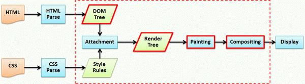 首先會將位於URL位置的文件下載,分析其語法後建立DOM Tree (Document Object Model –HTML文件中的標籤為可被操作物件的結構),並依據CSS定義計算網頁的呈現結構(Layout) ,再產生Render Tree。此Render Tree是一個繪製網頁的場景結構,跟DOM tree結構類似。接下來的Painting流程會呼叫物件定義的繪製函式將物件繪製出來。全部物件都繪製完畢後,將這些結果疊加合成為要顯示的影像,再將之顯示於螢幕上。