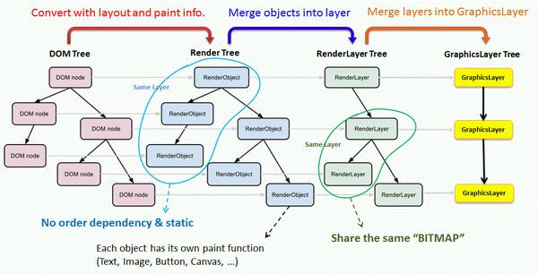 首先,在DOM Tree中,只有會顯示在螢幕上的物件才會轉換成Render物件,而這些Render物件都會有自己繪製的函式,讓繪製場景的引擎呼叫。Render物件最後繪製完成後的結果,會被疊加合成成一張最後顯示的影像。Layer的作用是為了減少繪製的結構,如果物件是沒有順序關係或是靜止的,便可以共用同一層Render Layer。Graphics Layer是一個對應到平台實作的抽象結構,不同平台會有不同的實作層。最後,Webkit中的Compositor會將這些Graphics Layer的影像疊加合成最後顯示在螢幕上。