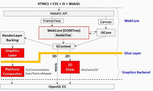 下圖是Webkit Rendering的流程架構圖,大致上分為三層來說明,WebCore、Glue Layer和Graphics Backend。這裡可以看出Webkit對於平台移植有一個很好的設計。最上面這部份是屬於WebCore的Layout Engine的實作層,中間則是連接這兩層的Glue Layer。最下面是平台相關的圖形功能實作層,也就是能使用GPU硬體加速的地方。