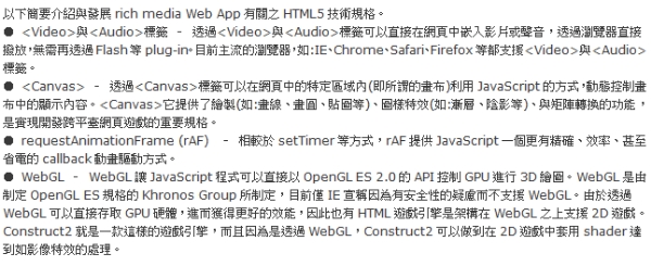 HTML5是新一代網頁與Web Application技術的統稱,其規格並非W3C官方所一手主導,而是先由Apple、Opera等業界所組成的WHATWG (Web Hypertext Application Technology Working Group) 所制定,後來再整入W3C體系中。與過去的HTML規格相比,HTML5的特點之一,就是不需要透過Flash等外掛程式(plug-in),能夠直接在瀏灠器或是HTML5相容的執行平臺上,呈現整合2D/3D與影音的即時互動rich media效果。近兩年來越來越多的裝置、網路服務或內容廠商開始投入HTML5技術的開發或是改使用HTML5技術發展其內容。例如: Amazon在2011/8推出以 HTML5 內容為主的雲端電子書平臺;Financial Times 在2011年將其 iOS App版本的閱讀程式全部改成HTML5 Web App版本,並在10個月內吸引到 2百萬的讀者使用;經濟學人也在 2012 年初捨棄 native App改採 HTML5 Web App;LG 和 Philips / TP Vision 組成 Smart TV 聯盟,鼓勵開發者以 HTML5 為基礎開發跨平臺的獨立應用程式;Google力推其 Chrome 為 Web Game Console等。可以預見的,HTML5 Web App的應用將會越來越廣泛。