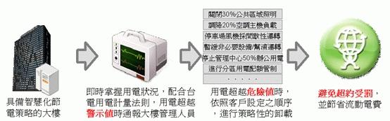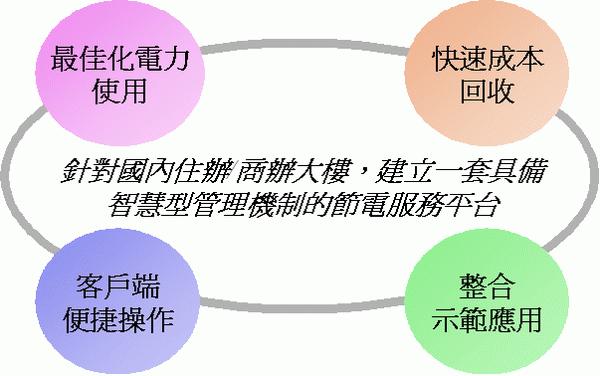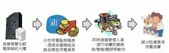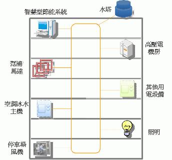 如下圖所示,將透過通訊網路連結建築物內的耗電設備,再藉由節電服務平台(智慧型節電系統),提供各項節電措施:電力需量控制、負載排程移轉、用電預測分析、用電異常監測等節電策略應用。