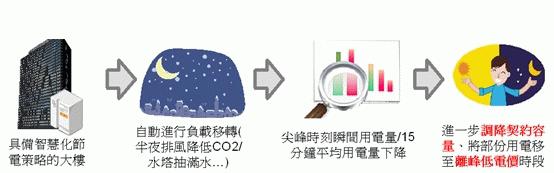 若建築物導入智慧型用電監測系統,未來應用模式將可自動進行負載移轉(半夜排風降低CO2/水塔抽滿水…),可讓尖峰時刻瞬間用電量/15分鐘平均用電量下降,進一步可調降契約容量、將部份用電移至離峰低電價時段達到節電效果。