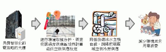 若建築物導入智慧型用電監測系統,未來應用模式將可進行環境取樣分析,調查空調過度供應區域與計算最佳空調供應設定,降低後端冰水主機負載,調降前端區域空調冷房供應,減少環境異常用電浪費。